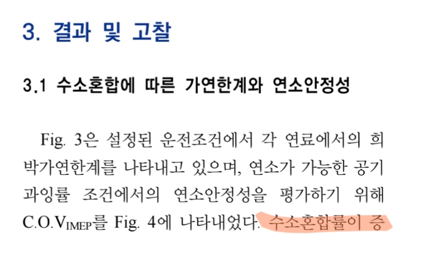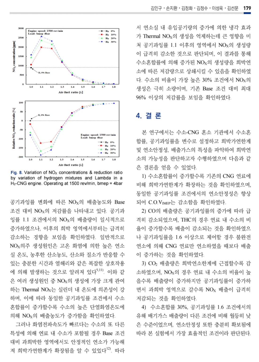 - 가장 크게 관여하는 thermal NOX는 실린더 내 온도에 의존성이 큰데 동일한 공기과잉률 조건에서 수소혼합률이 증가하면 수소의 높은 단열화염온도로 인하여 NOX의 배출농도가 증가한다