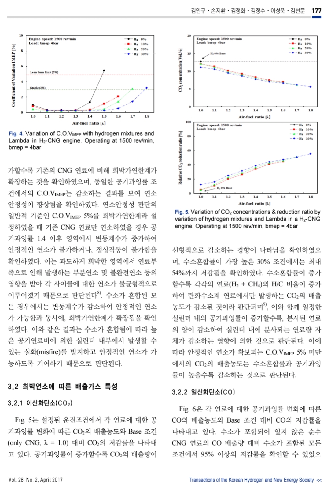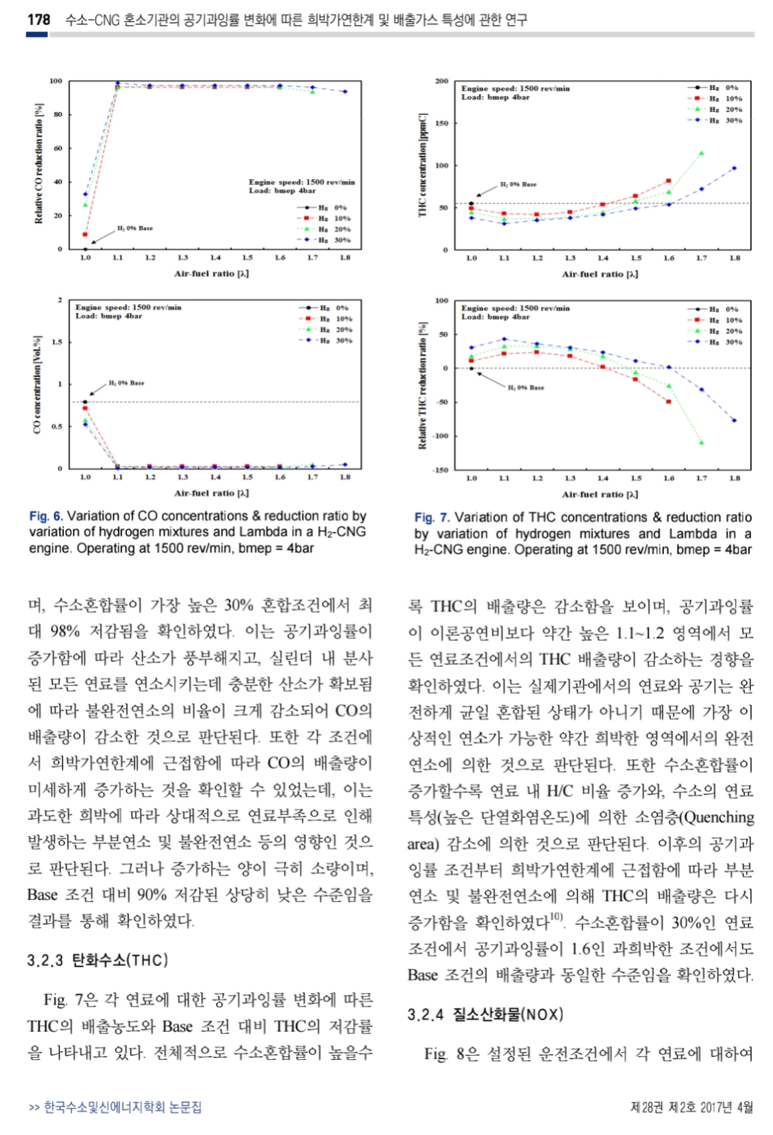 - 공기과잉률 조건부터 희박가연한계에 근접함에 따라서 부분 연소와 불완전연소로 탄화수소 배출량은 다시 증가하게 됨. 수소혼합률이 최대인 30%에서는 일반 조건과 동일한 수준임