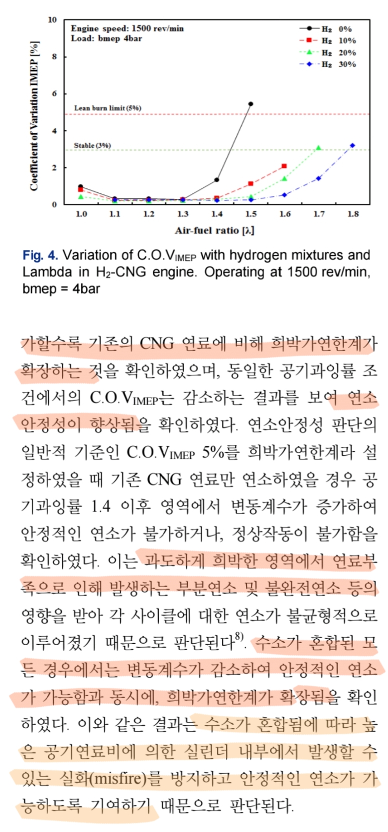 - 하지만 화염전파속도가 빠른 수소의 특성 때문에 안정적인 연소가 가능하여 희박가연한계가 확장됨