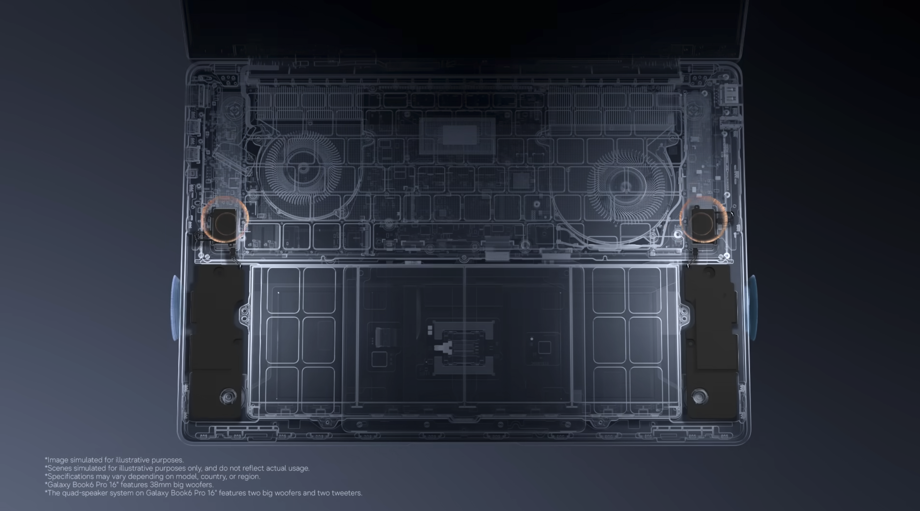 16인치의 경우 전작의 경우에도 트위터와 우퍼가 따로 존재하는 4-way 스피커 시스템이였지만 하나의 스피커홀을 트위터와 우퍼가 공유하여 최신 레노버나 아수스의 고급 라인업들이 맥북 에어에 준하는 스피커 성능을 내는 것에 비하면 아쉬운 스피커 성능을 보여주었는데 조금이나마 개선이 이루어지지 않을까 생각하고 있습니다만 유튜버들의 공통적인 리뷰를 보면 큰 개선은 없다고 합니다. 우퍼의 사이즈는 38mm로 전작과 동일합니다